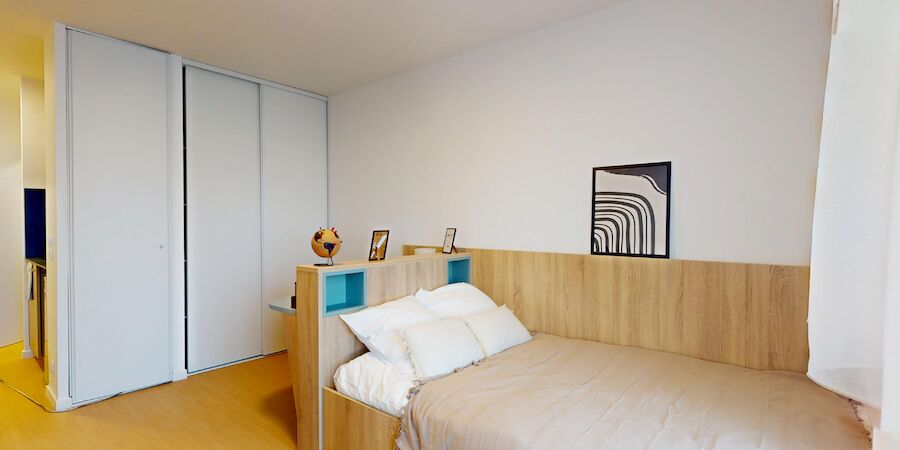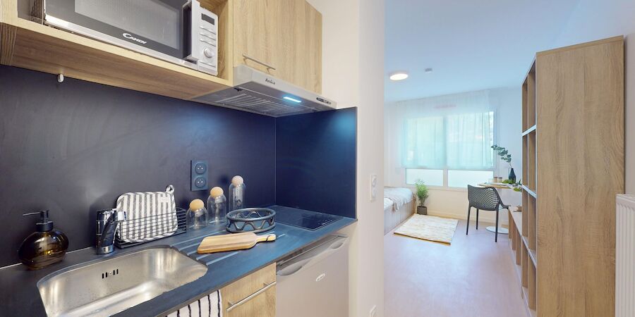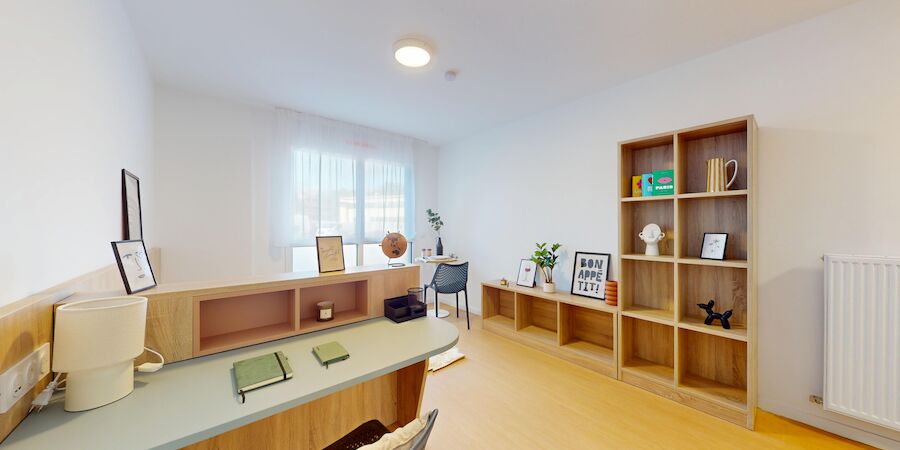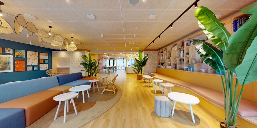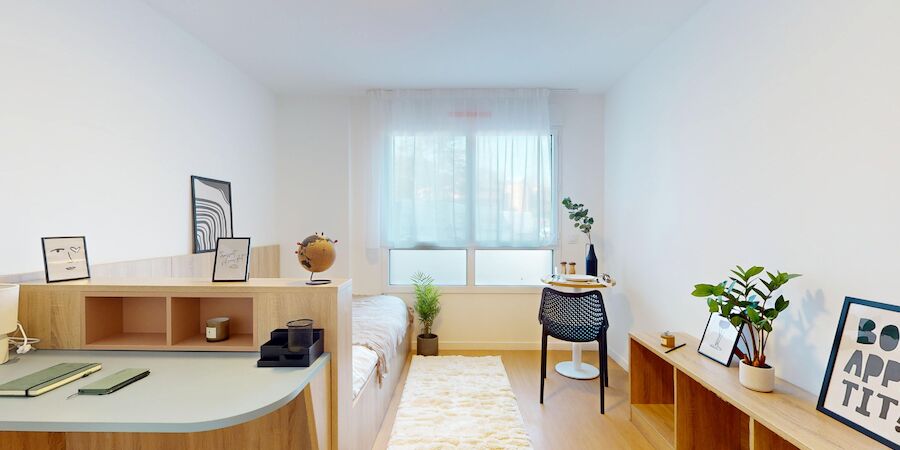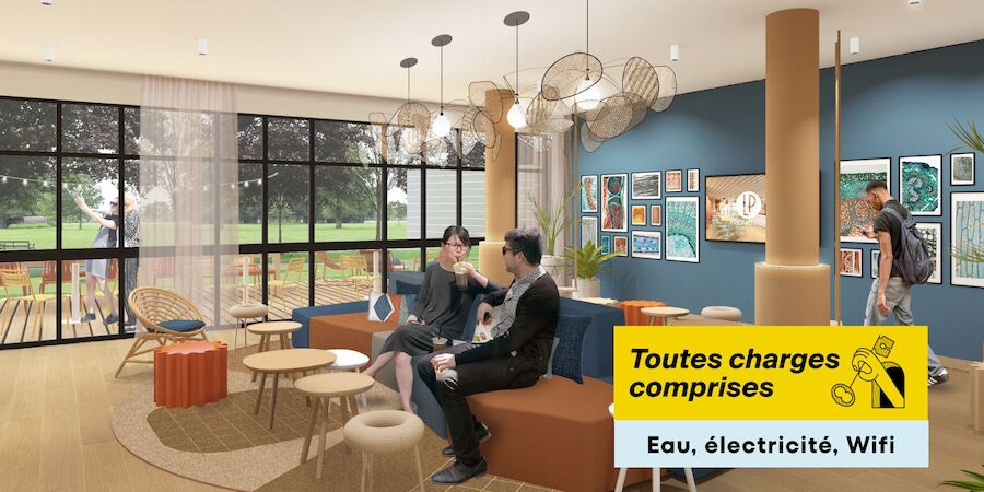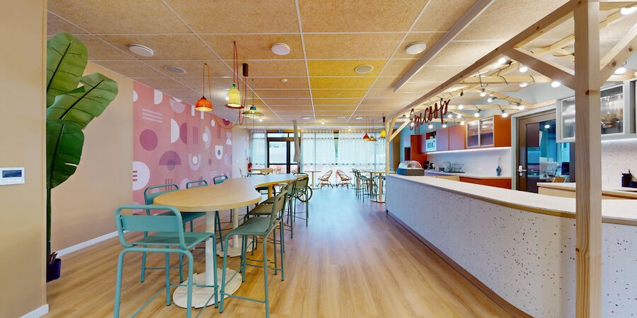 À l’intérieur, la résidence se pare d’une décoration conviviale et chaleureuse avec des espaces partagés comme une salle de détente, un espace cafétéria avec une Epicoop, des salles de coworking, une salle fitness et une laverie connectée.