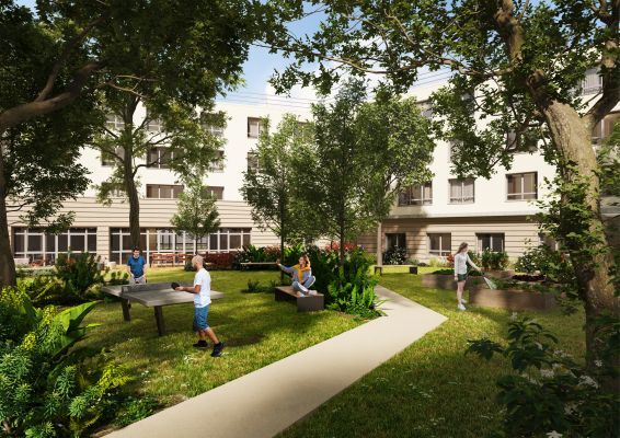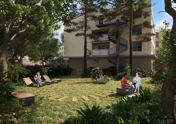 À l’extérieur les résidents pourront profiter de la terrasse commune, des tables de ping-pong, des jardins potagers partagés et aussi d’un espace de détente avec bancs et méridiennes, le tout entouré d’arbres. Aussi, la résidence met à l’honneur la biodiversité en créant des espaces pour la faune comme des abris à oiseaux, hôtels à insectes…